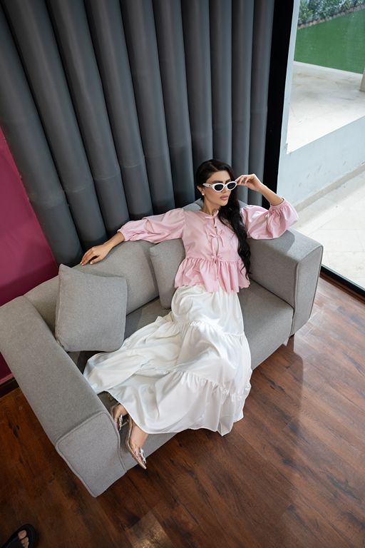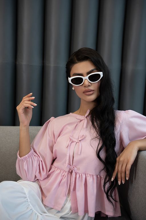Blush-toned top with tie-front details and a peplum silhouette — feminine, breathable, and perfect for work to after-hours.