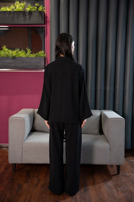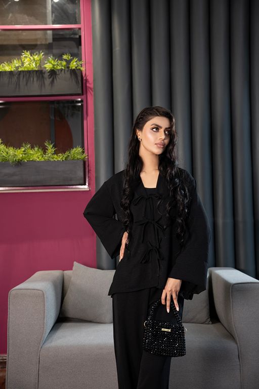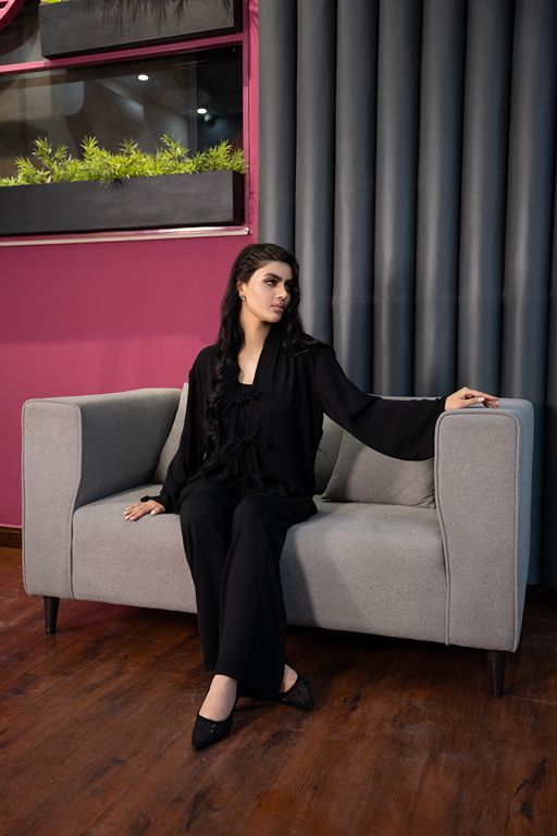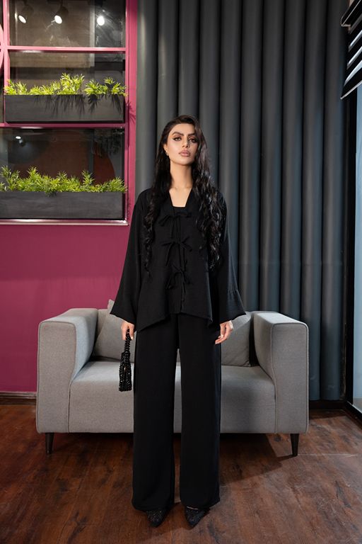 Featuring a chic kimono-style top with a front bow detail, paired with sleek straight-cut pants
