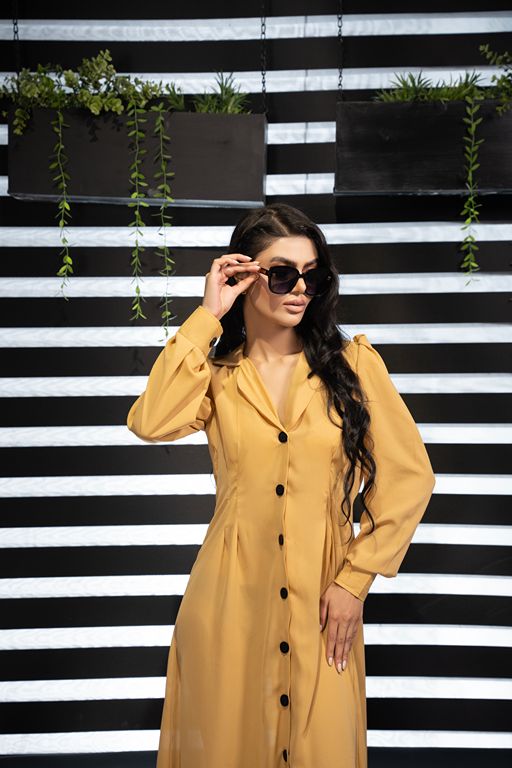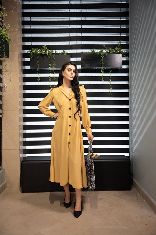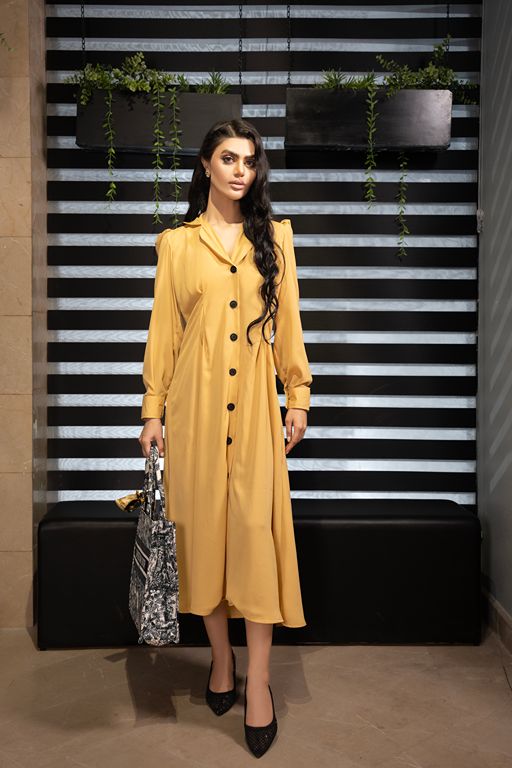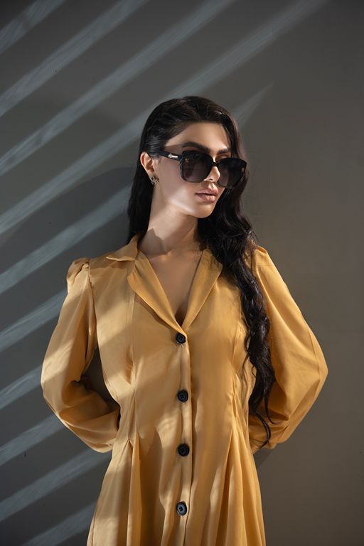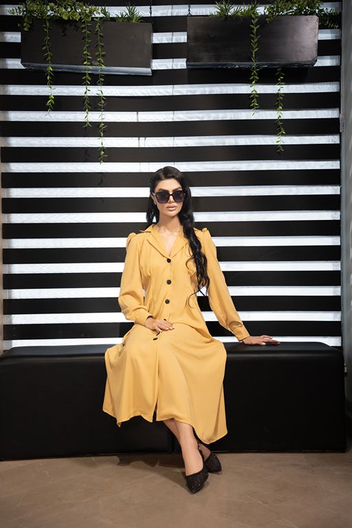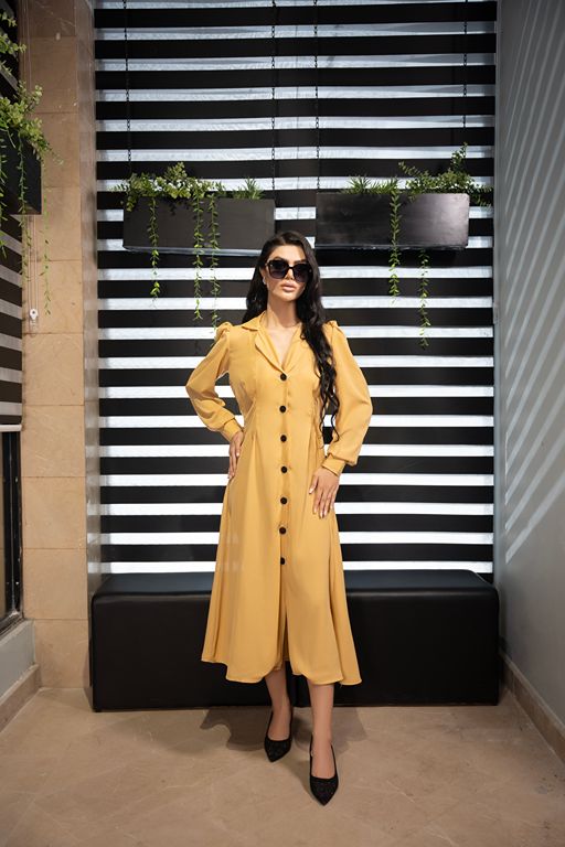 A long button-down dress designed with a sharp coat collar and front pleat details. Its bold silhouette combines elegance with power, making it a perfect choice for confident, modern women
